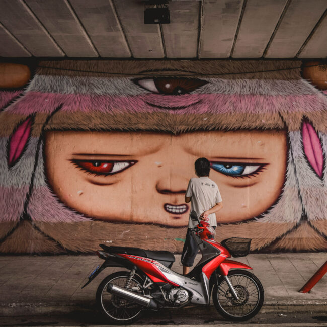 Bangkok’s streets tell stories. Walls are covered with murals, graffiti, and old paint that fade and overlap, showing how the city is always changing. Street artists work in this movement, using walls to express ideas, record the past, and claim their place. Their art moves between protest and poetry—revealing the