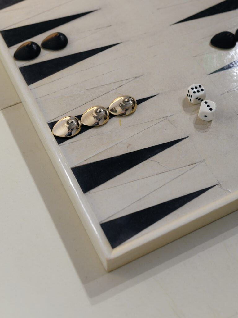 Piccoli Smalti: A backgammon drew particular attention. Part of a collection combining parchment and brass furniture with cloisonné bronze details and the designer’s “Forget Me Not” motif, the backgammon set transforms a familiar game into something sculptural. Call me crazy but it looks pretty sexy.