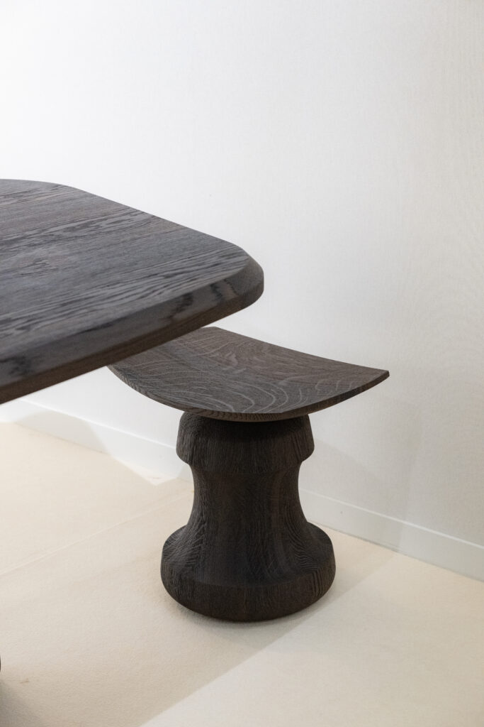 Collection Particulière: The curved wooden seat balances on a pedestal base that almost resembles a carved column or chess piece. Simple, solid, and slightly mysterious. It honors the integrity of the original material, and we love that.