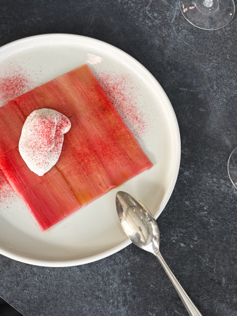 SCALE and lunch by Balbosté: at the center of the fair’s social life, a Tangram-inspired table turned dining into a design experiment. Composed of modular, geometric sections, the table could shift in scale throughout the day, moving from intimate clusters to a larger communal setting. The plates kept up. A towering slice of bread like a tiny architectural model, followed by a delicate, pink-toned rhubarb dessert dusted with powder and topped with a soft cloud of cream. Somewhere between lunch and installation. Almost too pretty to eat. Almost. Together, it brought color, rhythm and a sense of play to the space, proof that even a lunch table, when done right, can become the main character.