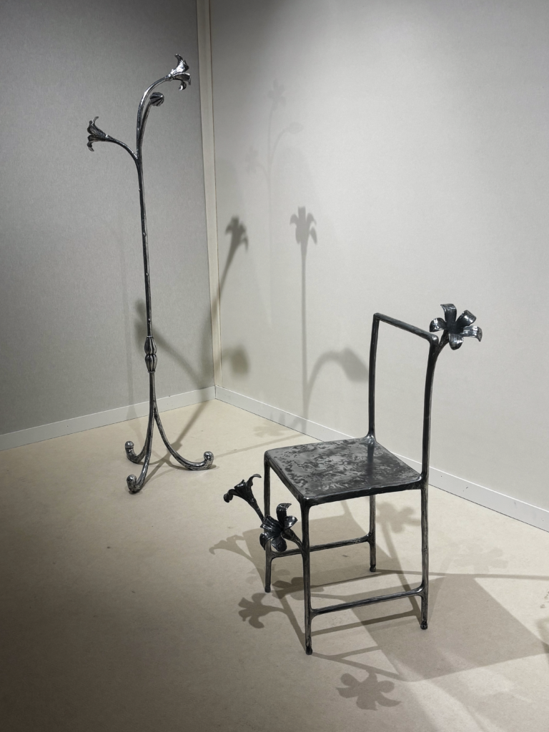 Conie Vallese, Bloom Chair: A steel chair and coat stand that looked like they had secretly sprouted lilies overnight. Thin stems rise from the frame and bloom at the corners, turning otherwise industrial furniture into something that feels halfway between garden sculpture and somewhere you’d happily hang your coat.
